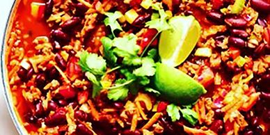 PULLED OUT OAT PROTEIN, LOADED WITH IN SEASON VEGGIES. SERVED WITH QUINOA, FLAXSEED BLUE CORN CHIPS.