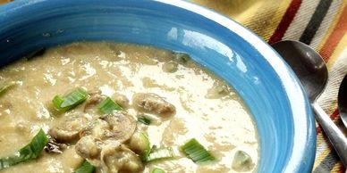 CREAMY GARLICKY POTATO, MUSHROOM AND LEEK SOUP, MADE LOW CARB WITH CAULIFLOWER PUREE.