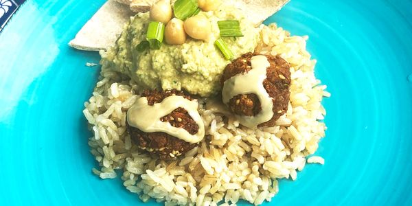 (2) FALAFELS OVER TOUN INFUSED BROWN RICE, TOPPED WITH TAHINI & ACCOMPANIED BY KALE / CHICKPEA HUMMUS AND FLATBREAD. (TOUN IS DELICIOUS A LEBANESE GARLIC & CITRUS SAUCE)