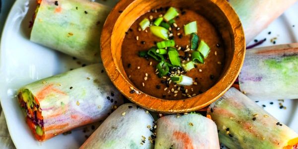 $7h ) RICE PAPER WRAPPED ROLLS, FILLED WITH MARINATED BAKED TOFU STRIPs, PURPLE CABBAGE, CARROTS, MUNG BEAN NOODLES & MIXED GREENS. PAIRED WITH PEANUT SAUCE & RICE WINE VINEGAR SAUCE.